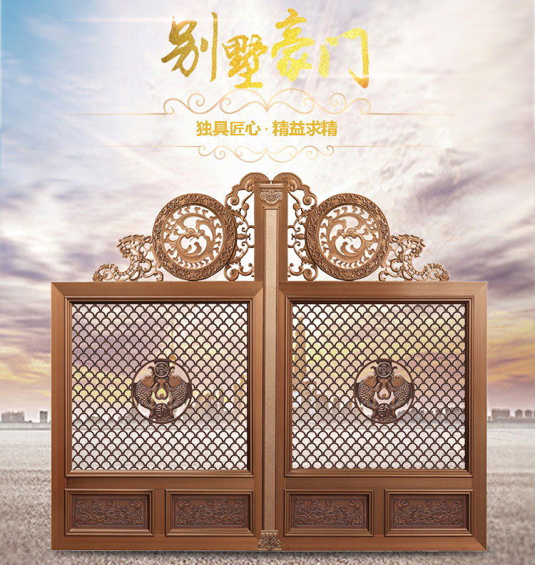 产品详情:四合院大门的主要材质是铝,整体由纯铝制成。它是通过一次开启模具并一次成型的先进技术铸造而成的,因此被称之为新型的整体铸铝门。相比,铁庭院门仍使用传统的铸铁铸造和现场焊接工艺另一方面,从外观,维护,成本和回收利用的出发点来看,铝艺庭院门远胜过铁艺庭院门。如今,无论是别墅还是家庭住宅,铝艺庭院门日渐受到顾客的青睐,越来越多的人选项铝艺四合院门。铝艺四合院门不仅兼具很高的装饰价值,而且具突出的风格特性:防腐,防潮,耐磨,耐高温。华丽的庭院门,精巧的图案,美妙的线条以及古典色调,营造出艺术美感