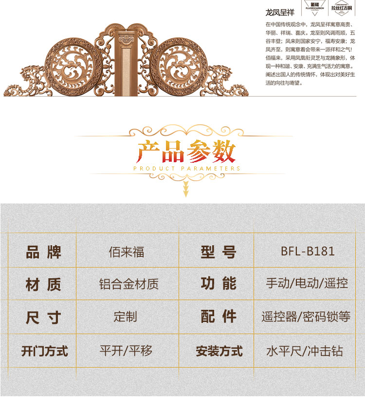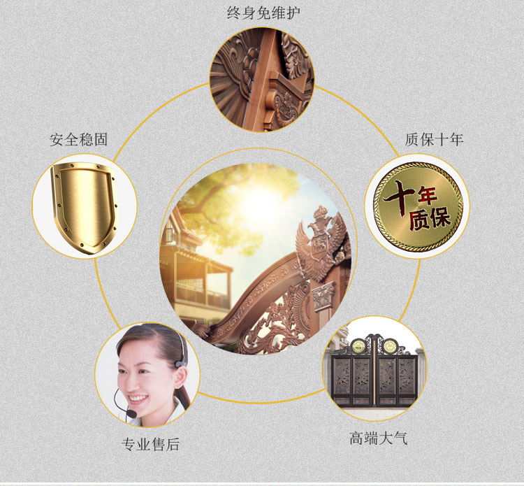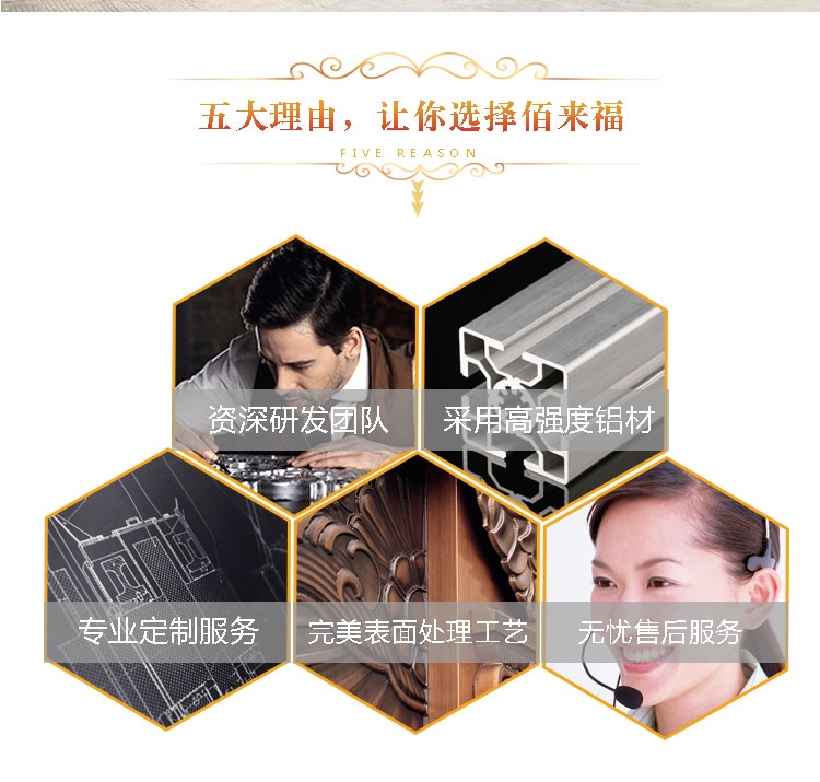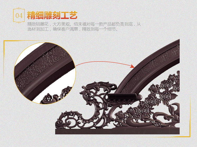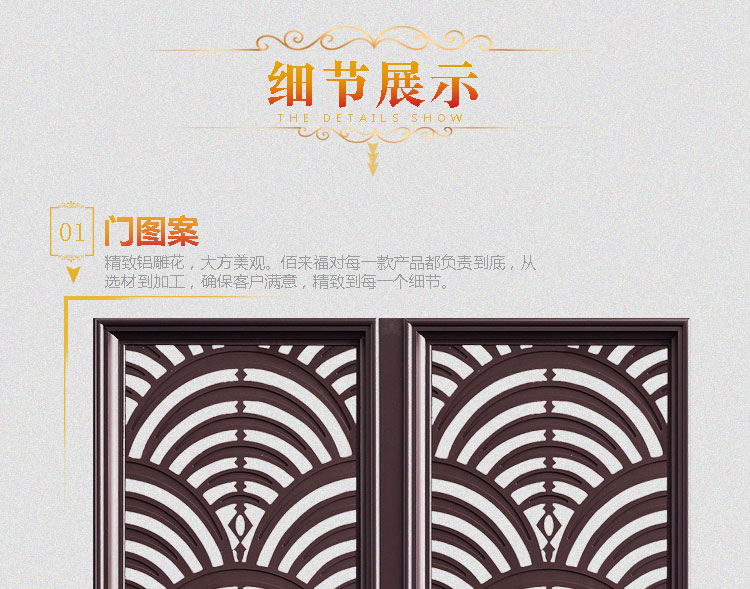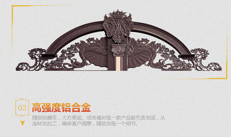 产品详情:佰福来铝艺门容易安装,不受地貌起伏的影响,适用于大门。在生产过程装饰方面,效用漆要求色调鲜艳,并使用进口漆手工上漆,简练,典雅,时尚。